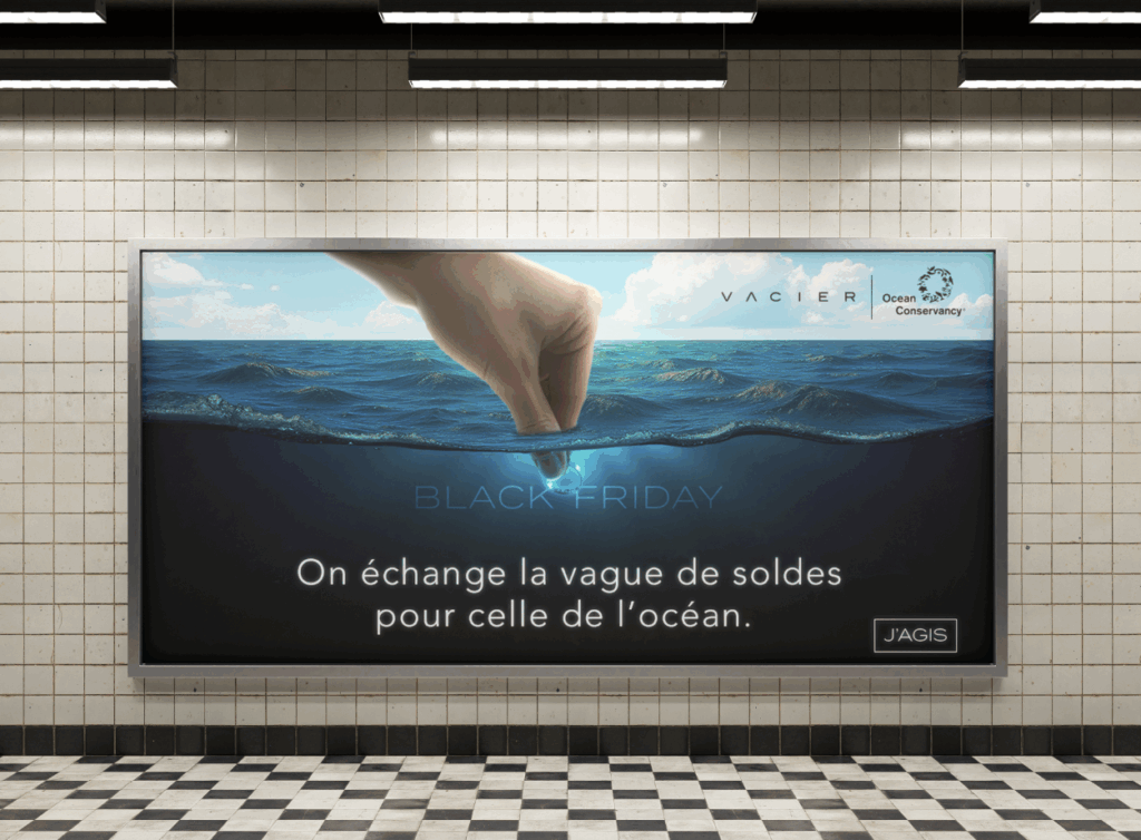 Par équipe, nous avons du imaginer un concept créatif sur une marque e-commerce choisie qui souhaite se démarquer pour le Black Friday. Le principe de cette campagne misait sur l'inoxydabilité des produits de la marque (qui est une valeur physique forte) et de contourner la surconsommation liée à cette date le Black Friday en intégrant un principe écologique : 10% de l'achat de bague revenait à une association de protection des océans. En outre, c'est un geste écologique et c'est une plus value pour le consommateur qui gagne une gravure sur son bijou.