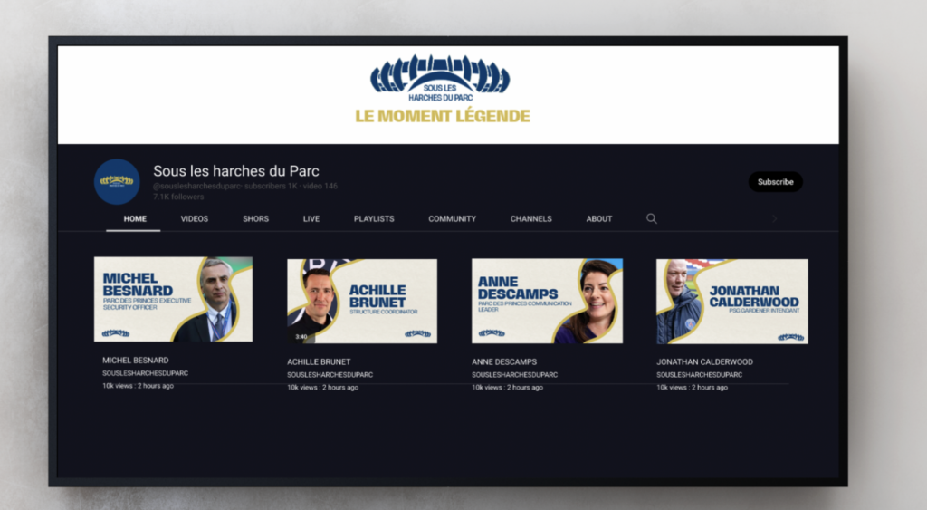 J'ai réalisé l'identité visuelle d'un vidéocast réaliste du Parc Des Princes. De la création du logotype depuis un moodboard, en passant par la rédaction de l'identité visuelle, ses assets ainsi que les mises en situation setup et création de contenus digitaux, j'ai pris un grand plaisir à créer ce système. De plus il est particulièrement en lien avec mon cursus où désormais les marques sont partout dans notre quotidien.